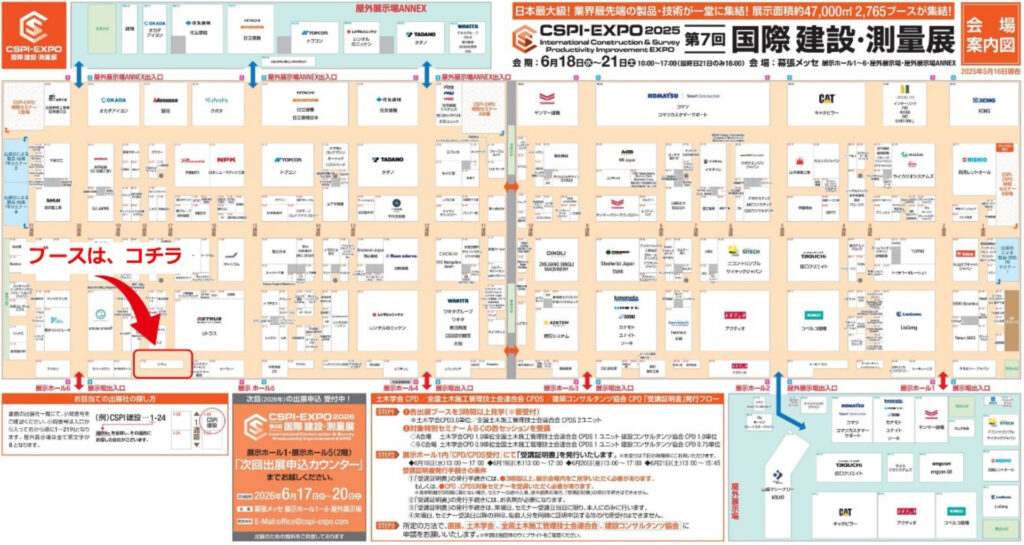 CSPI-EXPO 2025「第7回 国際 建設・測量展」に出展します 2025年5月28日 最終更新日時 : 2025年6月3日 bcwebadmin 2025年6月18日(水)~21日(土)に幕張メッセで開催されるCSPI-EXPO 2025「第7回 国際 建設・測量展」内のマプリィ社ブースにて、SBIR成果および「サポ楽」シリーズの展示を行います。 7回 国際 建設・測量展(CSPI-EXPO2025) FacebookXBlueskyHatenaCopy
