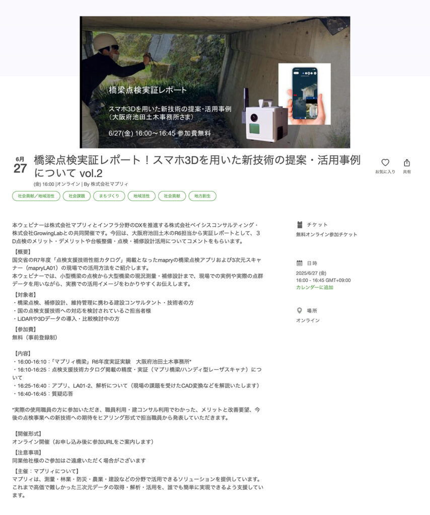第2回「スマホ点検アプリ/ハンディスキャナ」を紹介するウェビナーを開催 2025年6月16日 最終更新日時 : 2025年6月17日 bcwebadmin 新技術「スマホ点検アプリ(mapry橋梁)/ハンディスキャナ」をよりご理解いただくために、第2回目のウェビナーを開催させていただきます。今回は、大阪府池田工事事務所様を招いて実証内容を紹介させていただきます。 テーマ:「橋梁点検を次の時代へ。現場で使えるmapry橋梁アプリによるスマート点検手法」日 時:2025年5月16日(金) 17:00~17:45参加費:無料お申し込み:Peatixサイトよりお申し込みください。 お申し込みはコチラ FacebookXBlueskyHatenaCopy