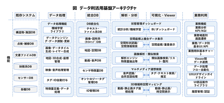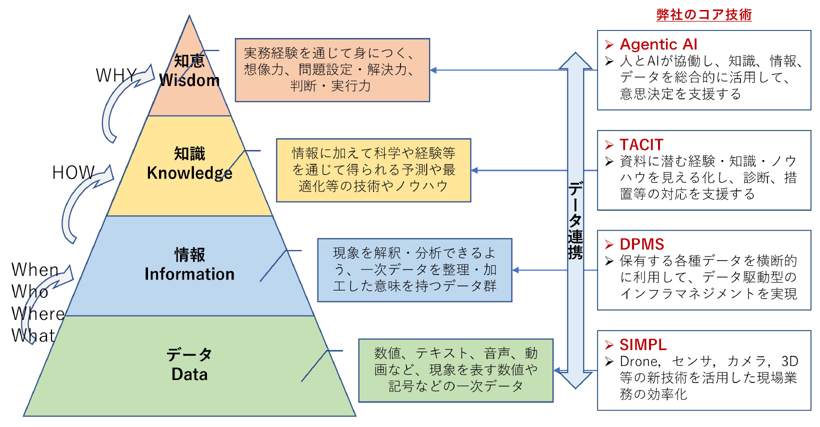 インフラ分野で取り扱う様々なデータをData/Information/Knowledge/Wisdomのレイヤで捉え、異なるレイヤ間のデータ連携を実現する技術基盤を実装しています。これにより、現場データから経営判断までシームレスにデータを繋ぎます。