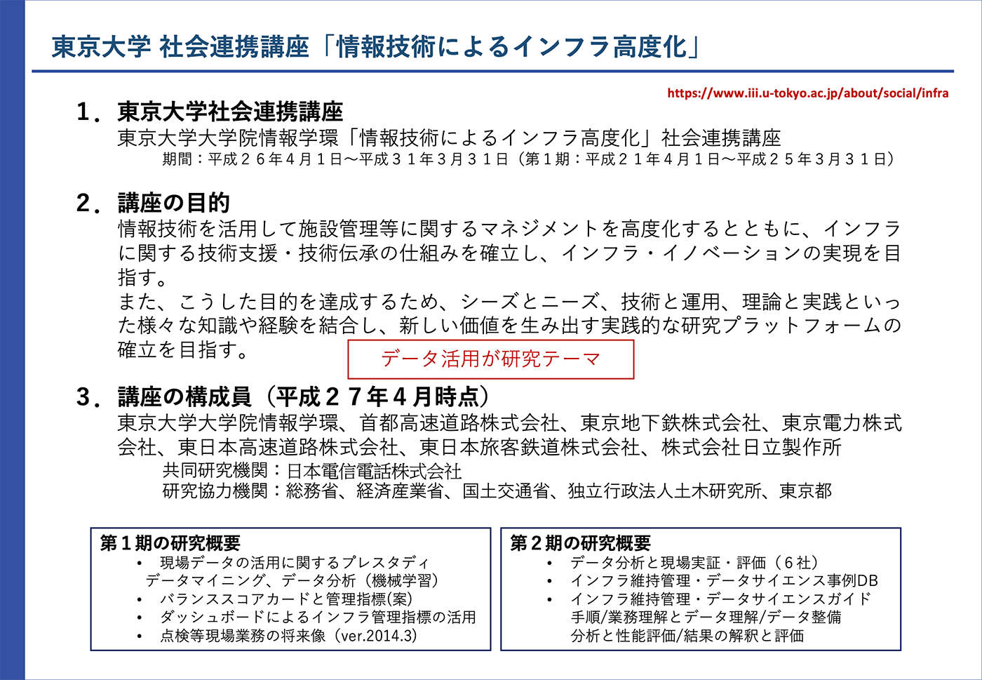 東京大学における多様なインフラ企業との共同研究、データ解析・活用に関する特許、ノウハウ等の知財、インフラとIT/AIの両分野に関する豊富な経験と知識、幅広い専門家のネットワークが技術のバックボーンです。