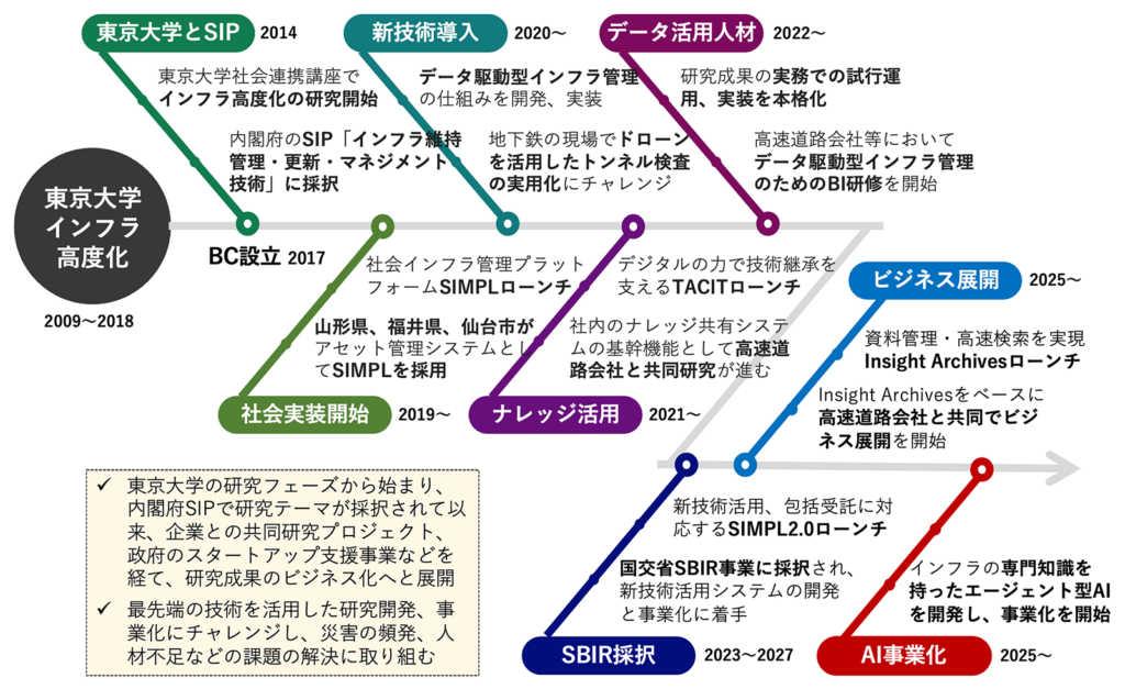 東京大学「情報技術によるインフラ高度化」社会連携講座を起点に、内閣府SIP事業、企業との共同研究、政府の事業支援を経てビジネス化へと展開。
