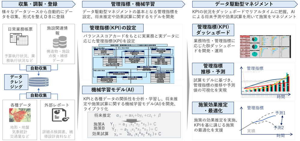 複数のシステムに蓄積されたデータの内容を確認し、言葉の誤り・揺れなどを調整して分析可能なデータとして修正しました。 - データ駆動型施設管理(道路事業)