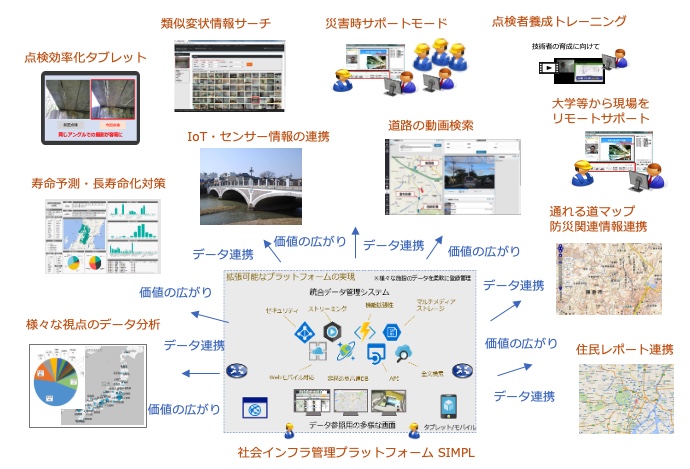 SIMPLは、それ自身で、橋梁、トンネル、法面、シェッド、舗装、河川、街灯、標識 など、様々な社会インフラのデータを効率的に管理し業務の改善につなげることができますが、それだけではなく、蓄積されたデータを自由分析で活用できたり、柔軟に他のシステムとデータ連携をしたりすることができるため、「プラットフォーム」として位置付けています。
